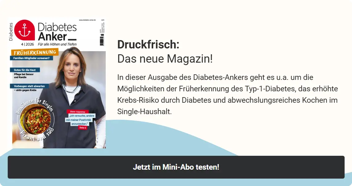 Die neue Magazin-Ausgabe ist ab sofort erhältlich: Dr. Katrin Kraatz aus der Chefredaktion stellt die Themen des Diabetes-Anker-Magazins 4/2026 vor. U.a. geht es um die Früherkennung des Typ-1-Diabetes, präventive Maßnahmen, um das erhöhte Krebsrisiko durch Diabetes zu senken sowie Tipps für abwechslungsreiches Kochen im Single-Haushalt.