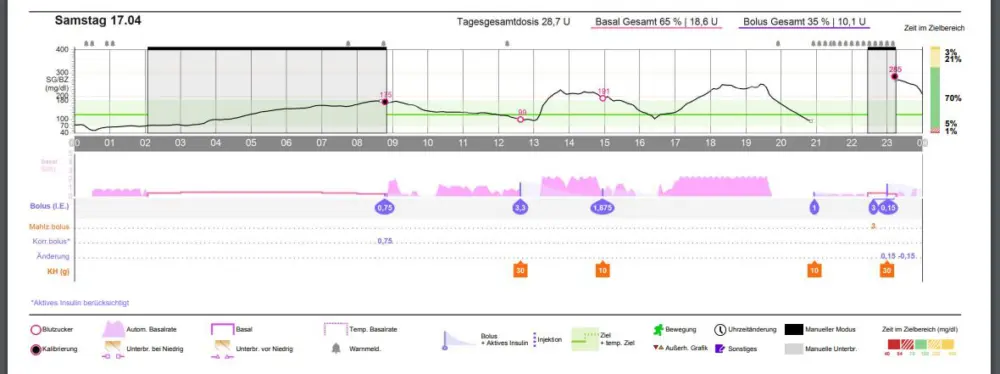 Wie bereits erwähnt, muss das Essen weiterhin mit einer Insulingabe VOR der Mahlzeit begleitet werden; also ist es wichtig zu wissen, ob die Kohlenhydratfaktoren auch wirklich stimmen. Vielleicht aber hat sich im Rahmen der bisherigen Therapie im Laufe der Zeit das eine oder andere „eingeschlichen“? Zum Beispiel kann die Basalrate aus verschiedenen Gründen am Vormittag zu hoch eingestellt sein oder der Mahlzeitenfaktor ist eher „schwach“, damit es nicht zu Unterzuckerungen kommt. Solche Schwachpunkte in einem Therapieschema zu erkennen, sollte Teil der Umstellung auf ein neues System sein.