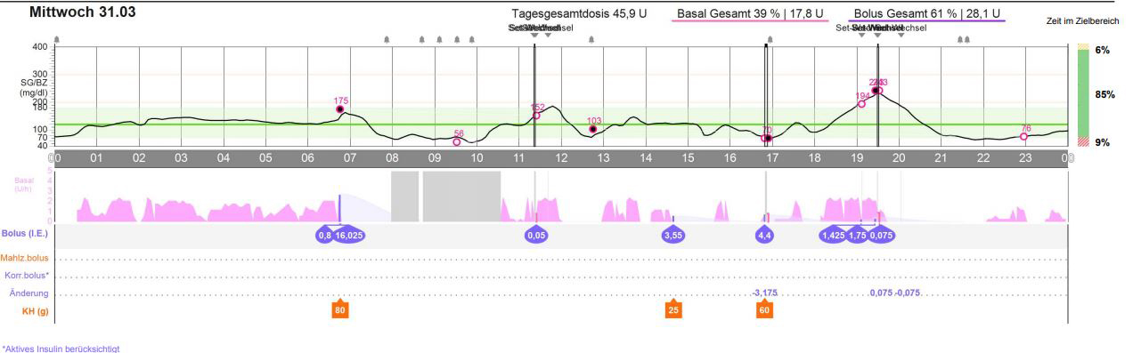 Wie bereits erwähnt, muss das Essen weiterhin mit einer Insulingabe VOR der Mahlzeit begleitet werden; also ist es wichtig zu wissen, ob die Kohlenhydratfaktoren auch wirklich stimmen. Vielleicht aber hat sich im Rahmen der bisherigen Therapie im Laufe der Zeit das eine oder andere „eingeschlichen“? Zum Beispiel kann die Basalrate aus verschiedenen Gründen am Vormittag zu hoch eingestellt sein oder der Mahlzeitenfaktor ist eher „schwach“, damit es nicht zu Unterzuckerungen kommt. Solche Schwachpunkte in einem Therapieschema zu erkennen, sollte Teil der Umstellung auf ein neues System sein.