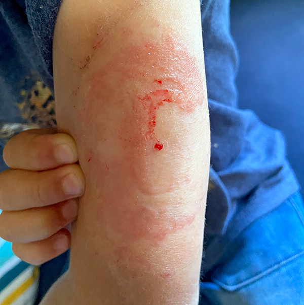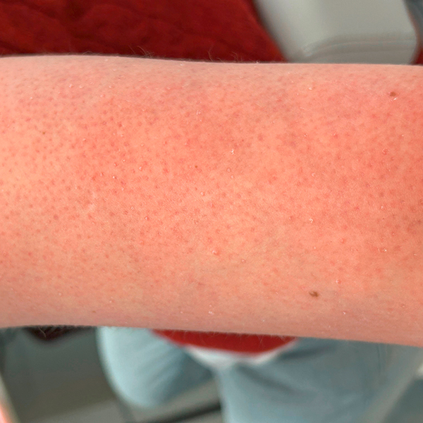 Irritative Kontaktekzeme (Abbildung 3) sind durch äußere Reize wie das Abdecken der Haut mit Pflastern bedingt. Das Ekzem kann bereits nach wenigen Stunden Tragedauer auftreten und zeichnet sich dadurch aus, dass es mal da ist, mal nicht. Neben Rötung und Schmerzen kann es auch trockene und schuppende Anteile geben.