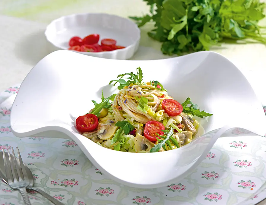 Rezept für Spaghetti mit veganer Pilzrahmsoße und Rucola-Topping