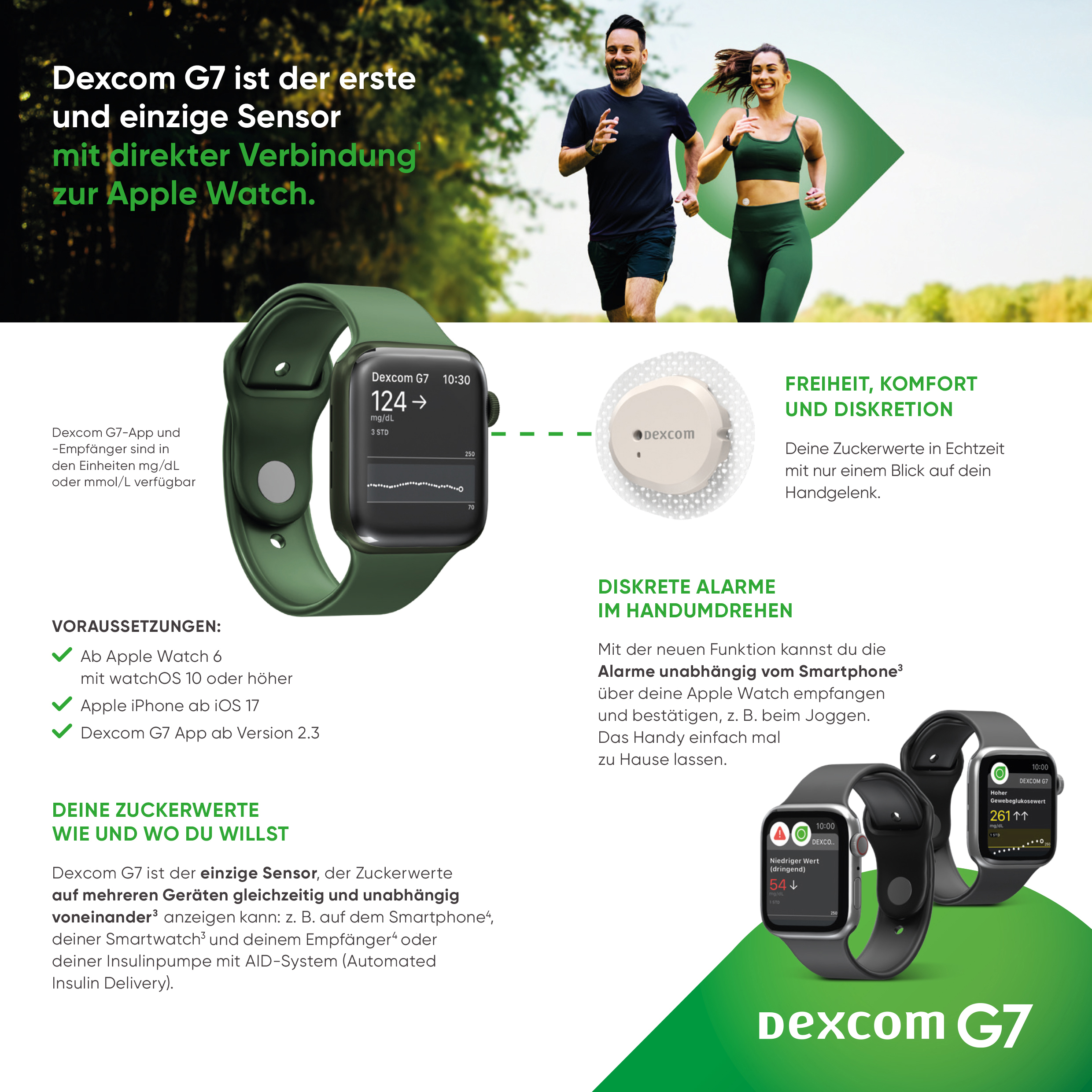 Glukosewerte direkt auf der Smartwatch, ohne das Handy mitnehmen zu müssen [3][4], statt Handy oder Receiver immer dabei haben zu müssen